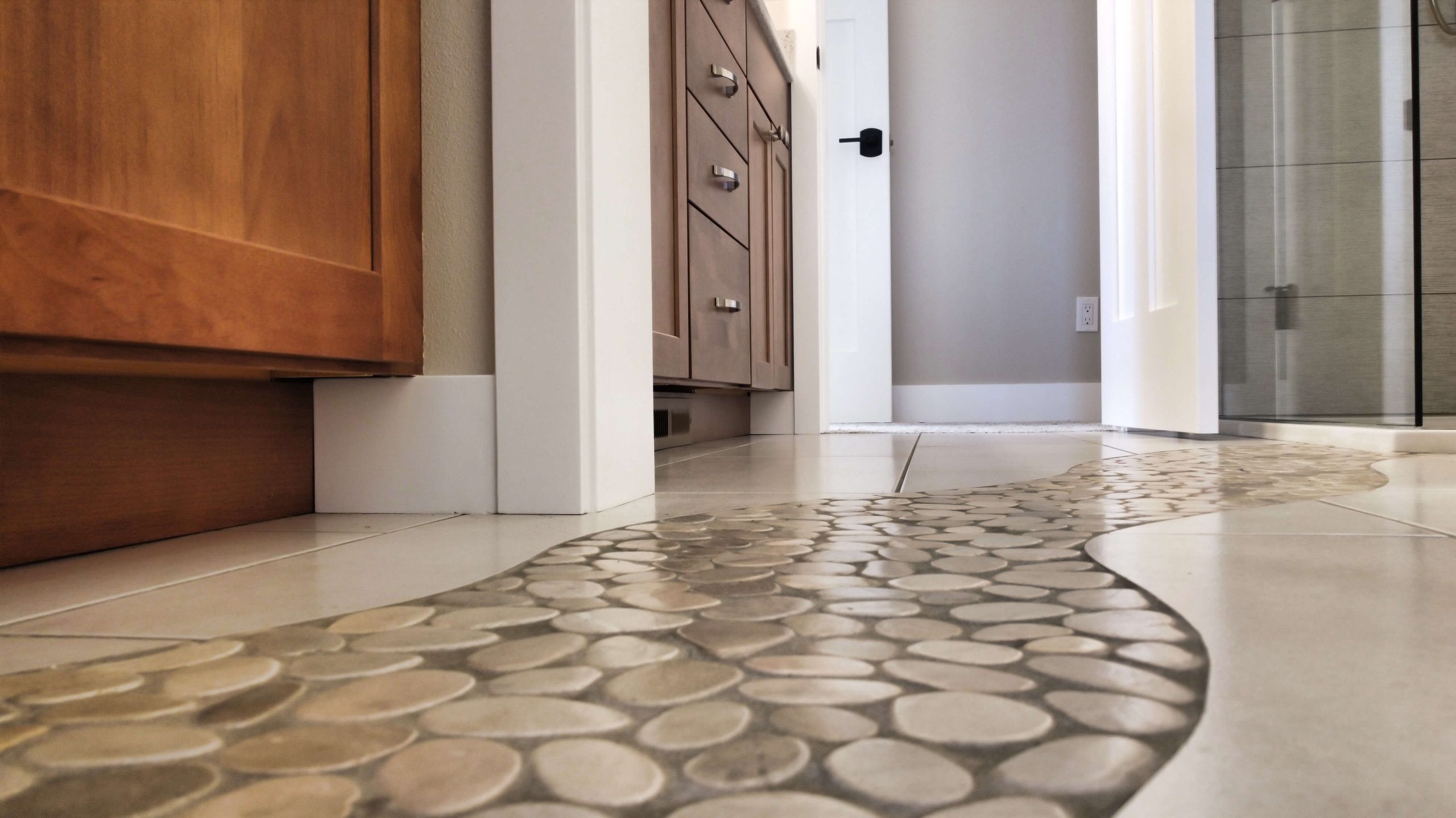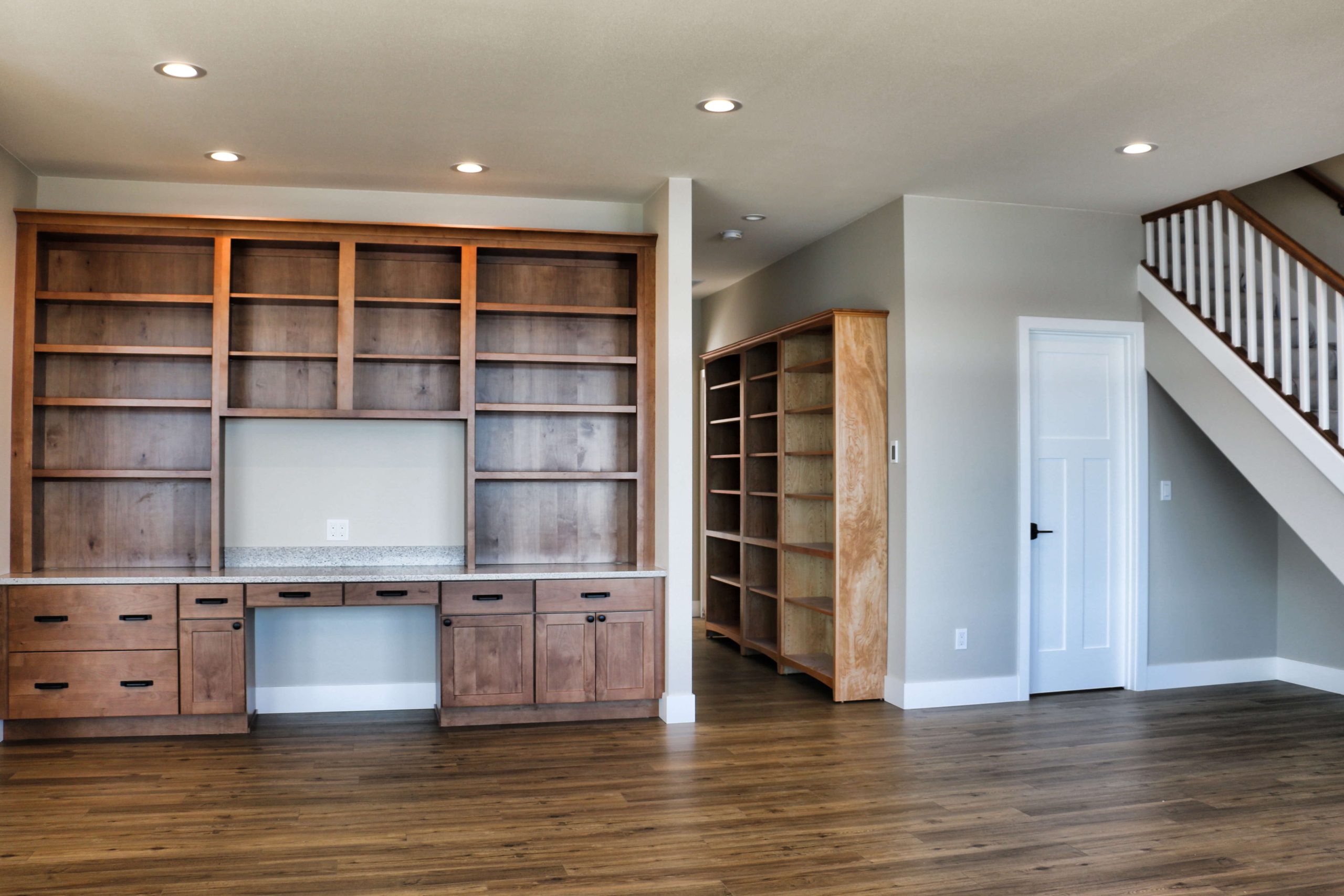 While we focusing on all the big picture items of this new custom home build, we also like to bring your attention to some finer details that can easily be overlooked. Working at home will be more organized with these Kemper Alder Built-in office cabinets. And even the bathroom has cosmetic appeal with a Custom River Rock Tile Path.